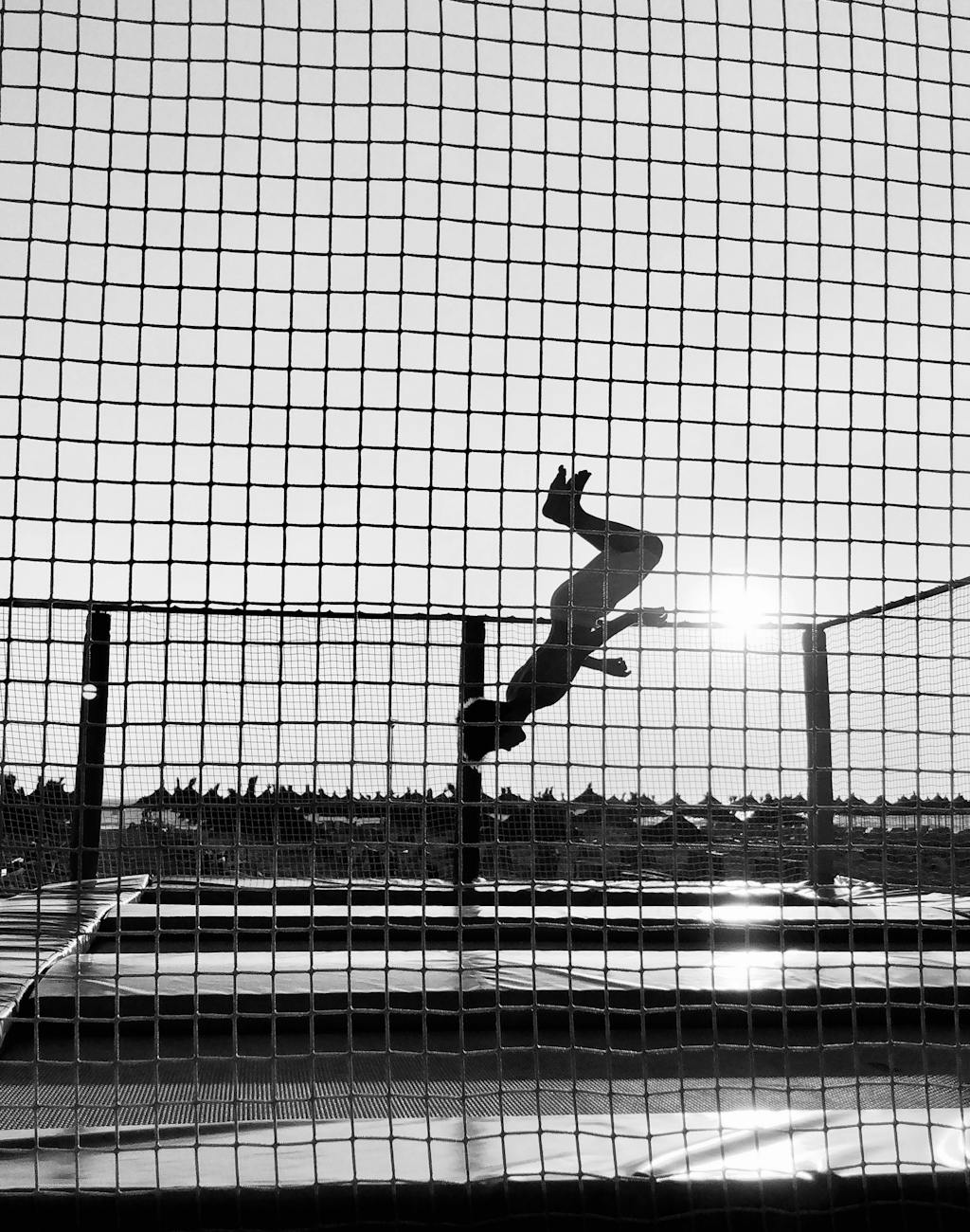 I’m gonna be the best in the world, the skinny kid with the thick glasses who needs to take them off to fly. I hear a familiar squeaking sound from the back fence. My rival is also practicing. She flies above the fence line, and we quietly wave to one another. My sister starts whining to climb up with me. And for a moment I get to be big brother again and hoist her onto the trampoline where we roll and laugh. Those gold medals and the crowd can wait until she goes in for her nap.